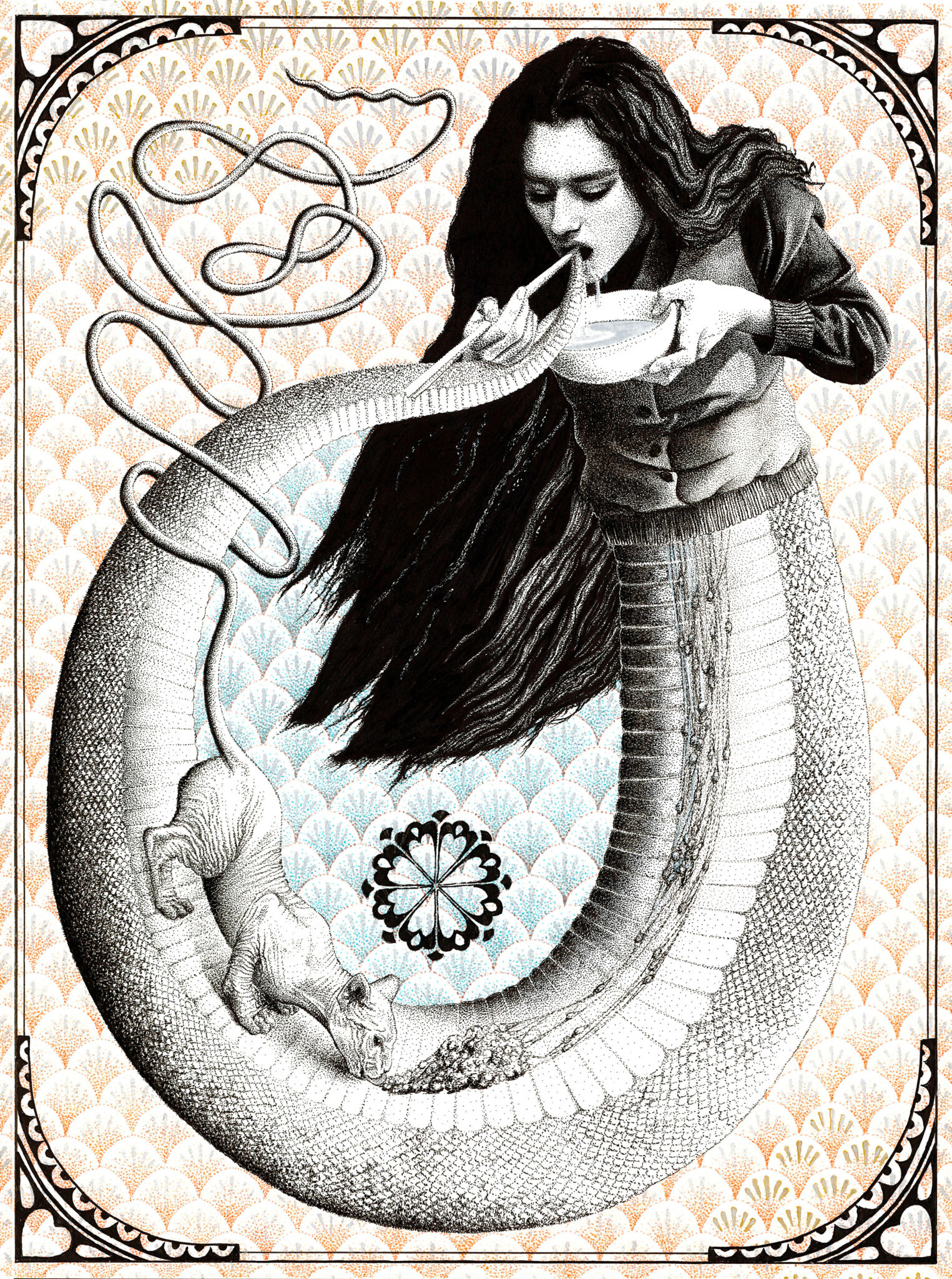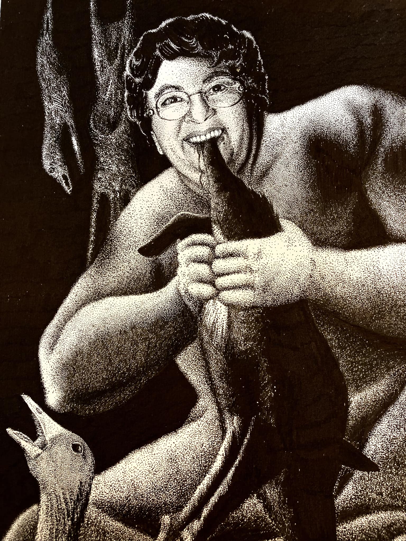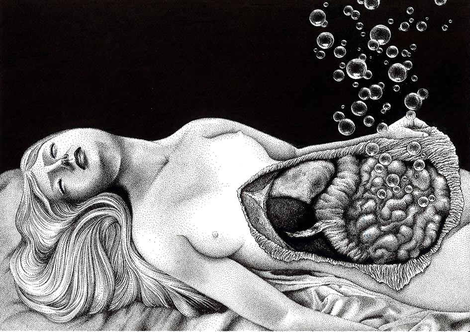 Nourrie de mythologie grecque et fortement inspirée par l’illustration naturaliste, elle explore notre rapport aux autres espèces, et de ce fait notre propre animalité, dans nos aspirations et notre quotidien, dans notre chair. Ainsi le corps, l’érotisme, la danse, la mort et le deuil, font partie intégrante de sa recherche.